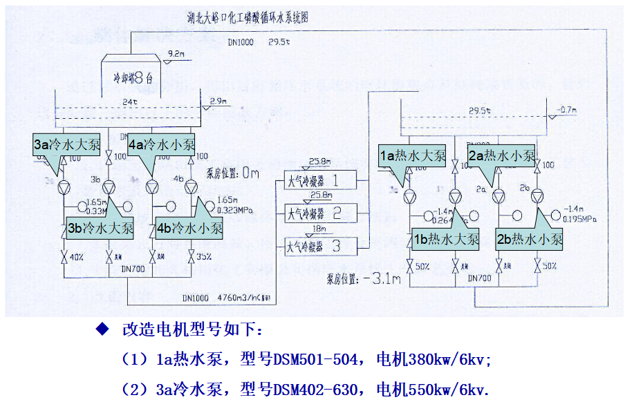 二、大峪口公司積極響應國家節能減排號召,針對其磷酸車間循環水系統進行節能改造,前后有多家公司提出了改造方案。將原有泵更換成高性能泵,提高水泵效率,并對其管道系統進行改造,其中2家節能公司提出通過節能泵對該系統進行改造。